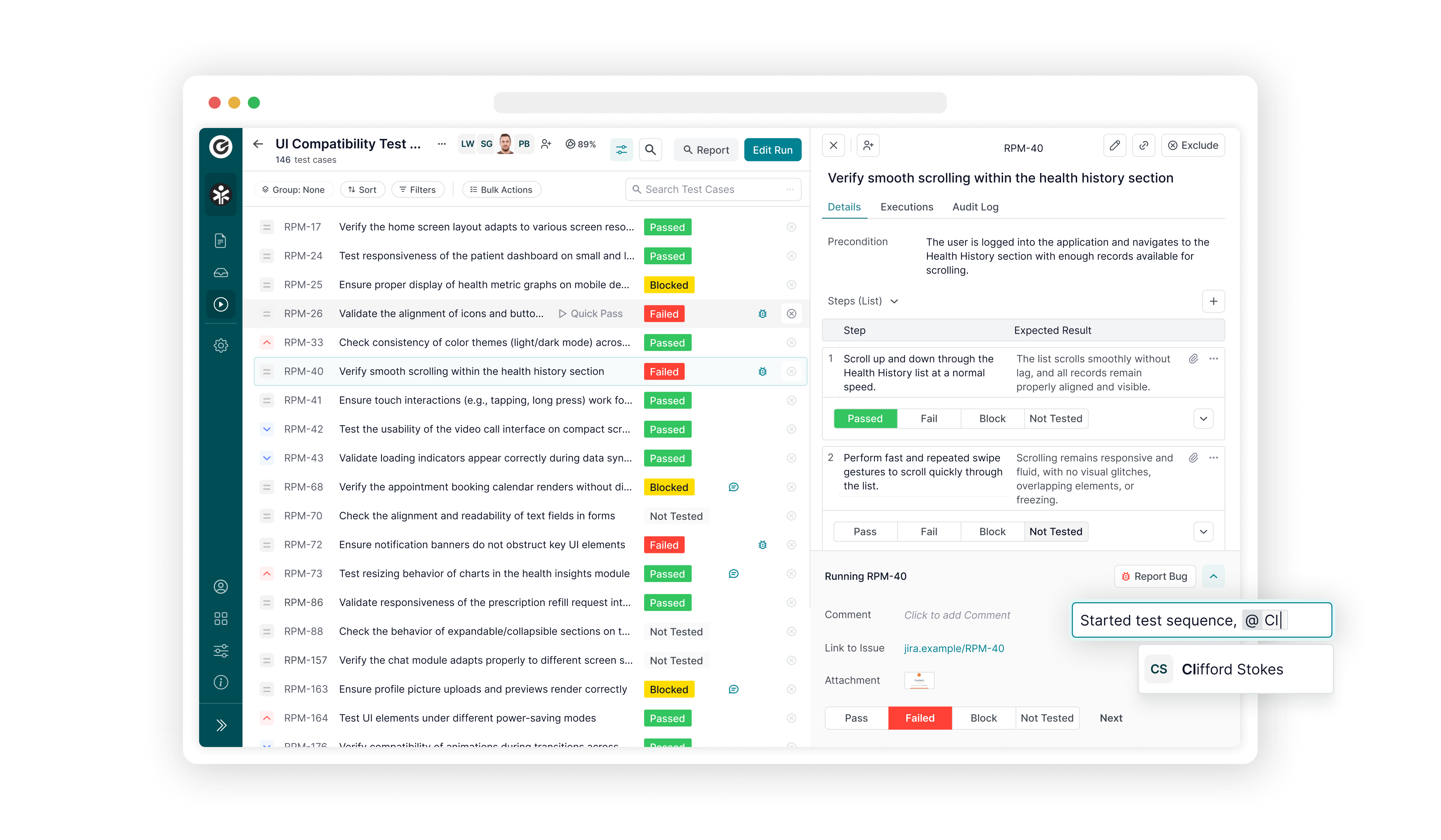 Run test cases directly from plans and track progress live with visual indicators. Failures trigger immediate bug reports.